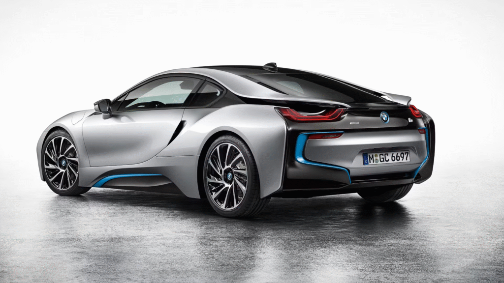 Instead of a large straight-six or V8, the i8 paired a compact 1.5-litre three-cylinder turbocharged engine mounted behind the cabin with an electric motor on the front axle. The petrol unit drove the rear wheels through a six-speed automatic gearbox, while the e-motor powered the front wheels, creating an all-wheel-drive plug-in hybrid layout that felt like it belonged in a limited-run hypercar rather than a series-production BMW. A lithium-ion battery sat low in the floor to keep the centre of gravity in check, and the whole structure was built around a carbonfibre-reinforced plastic tub with steel subframes at each end. Add in those butterfly doors, and you had a car that stopped conversations every time it parked.