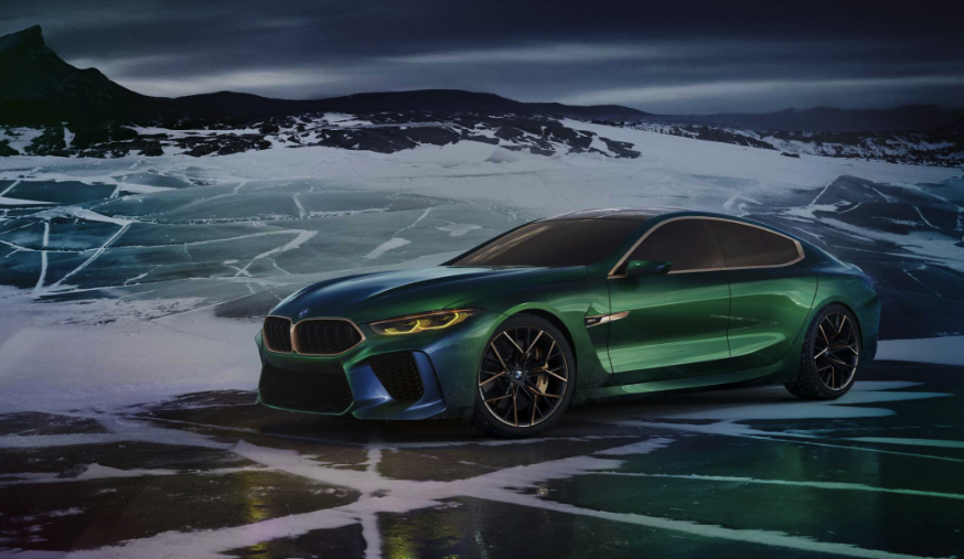 World premiere for the BMW Concept M8 Gran Coupe: Study car offers a look ahead to the most alluring and exotic variant of the new BMW 8 Series; emotionally compelling exterior design combines the core values of BMW M with elegance and luxury; dynamically stretched proportions; bonnet with muscular contours; large air intakes; Salève Vert paint finish appears to change in colour, combines with gold-coloured elements; visually prominent shoulder sections; CFRP roof; rear with powerful, imposing presence; concept study previews the BMW 8 Series Gran Coupe and BMW M8 Gran Coupe, which will be presented in 2019.