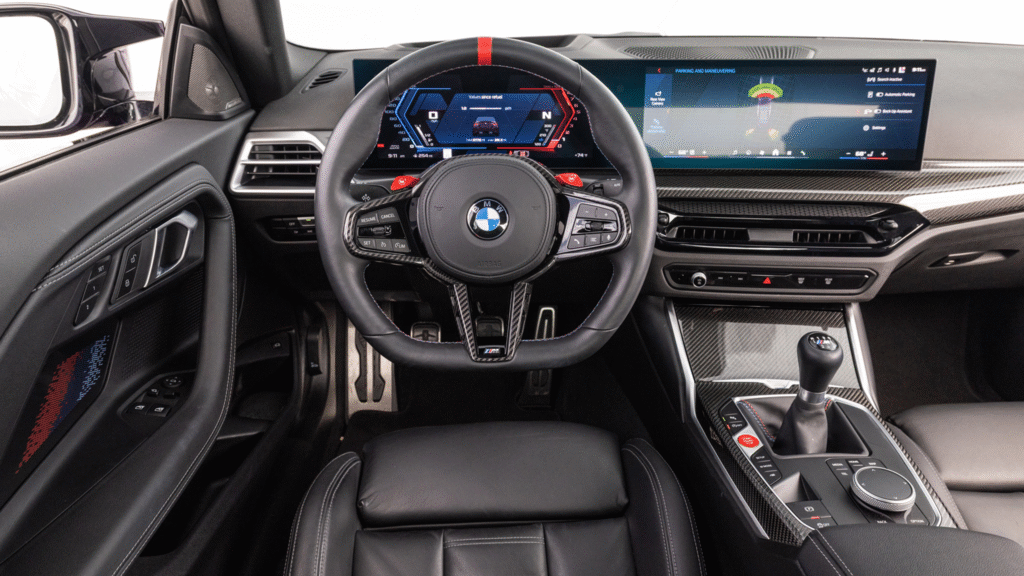 Inside, the cabin gains a curved display running BMW’s latest iDrive 8.5 software, paired with a sharper head-up display to keep speed and revs in your line of sight. The ergonomics are cleaner, the graphics crisper, and even the digital climate controls are straightforward enough to live with when the pace picks up. It feels modern without drowning out the analogue joy of a manual shift and a responsive throttle pedal.