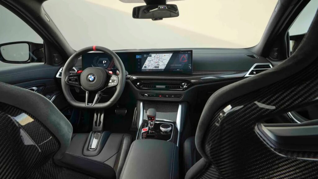 Inside, the M3 serves up the high-quality cabin you’d expect from BMW, with a clear step up in ambience over the standard saloon. A wide curved display combines a digital instrument cluster with a large central touchscreen running BMW’s latest operating system, which responds crisply to both touch and voice commands. Sports seats hold you firmly in place, and the optional carbon buckets add an even more purposeful feel for those who spend time on track. There are still plenty of cubbies and useful storage areas dotted around the cabin, so it works as a genuine daily driver rather than a weekend toy.