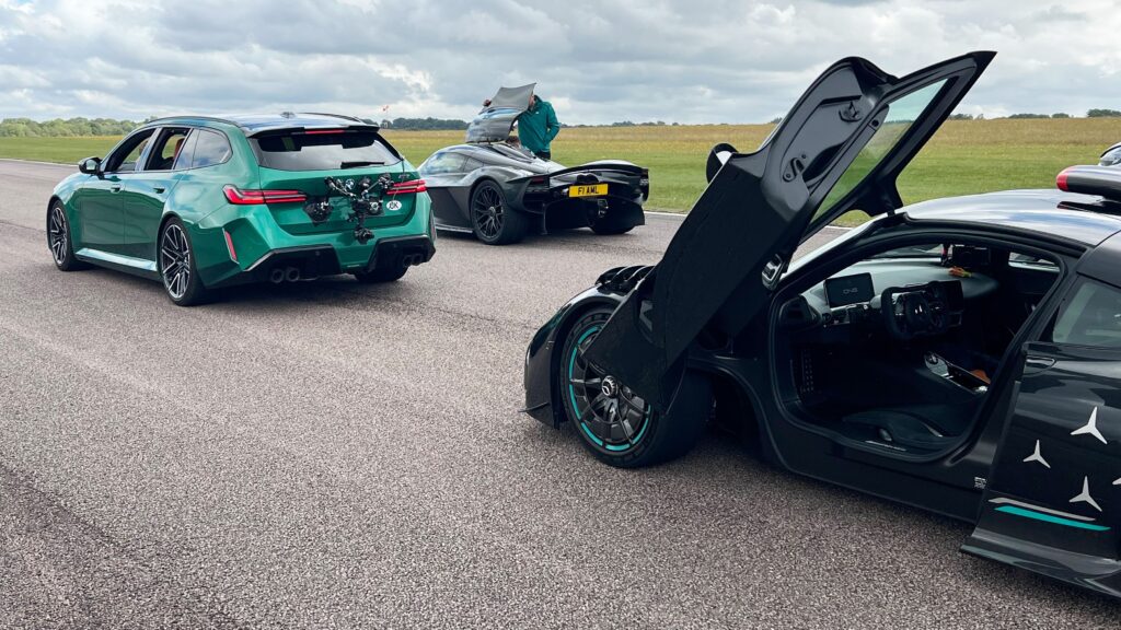 The real test has come from its role as a dedicated camera car. On shoot days, the M5 is loaded with a driver, two camera operators and a director, plus screens, cables and rigs running across the cabin. Add a nose-mounted, bladeless drone clamped to the front and the BMW nudges close to three tonnes, yet it is still tasked with hunting down some of the quickest machinery on the planet. It has chased an Aston Martin Valkyrie around Thruxton, kept a Koenigsegg CC850 in its sights at high speed, and shadowed an Aston Valhalla at Silverstone, all while maintaining a smooth, stable platform so the crew can capture usable footage.