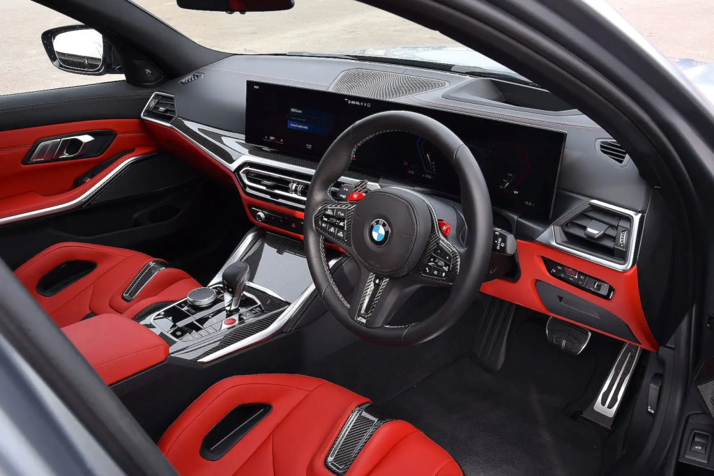Step inside, and the M3 showcases its dual nature: luxury and sportiness coexist seamlessly. Heavily bolstered sports seats, carbon-fibre accents, and a host of technology upgrades distinguish it from the standard 3 Series. The intuitive infotainment system with a large central touchscreen and head-up display ensures effortless navigation and control. However, switching to touchscreen climate controls may require some adjustment for those who are used to physical buttons.