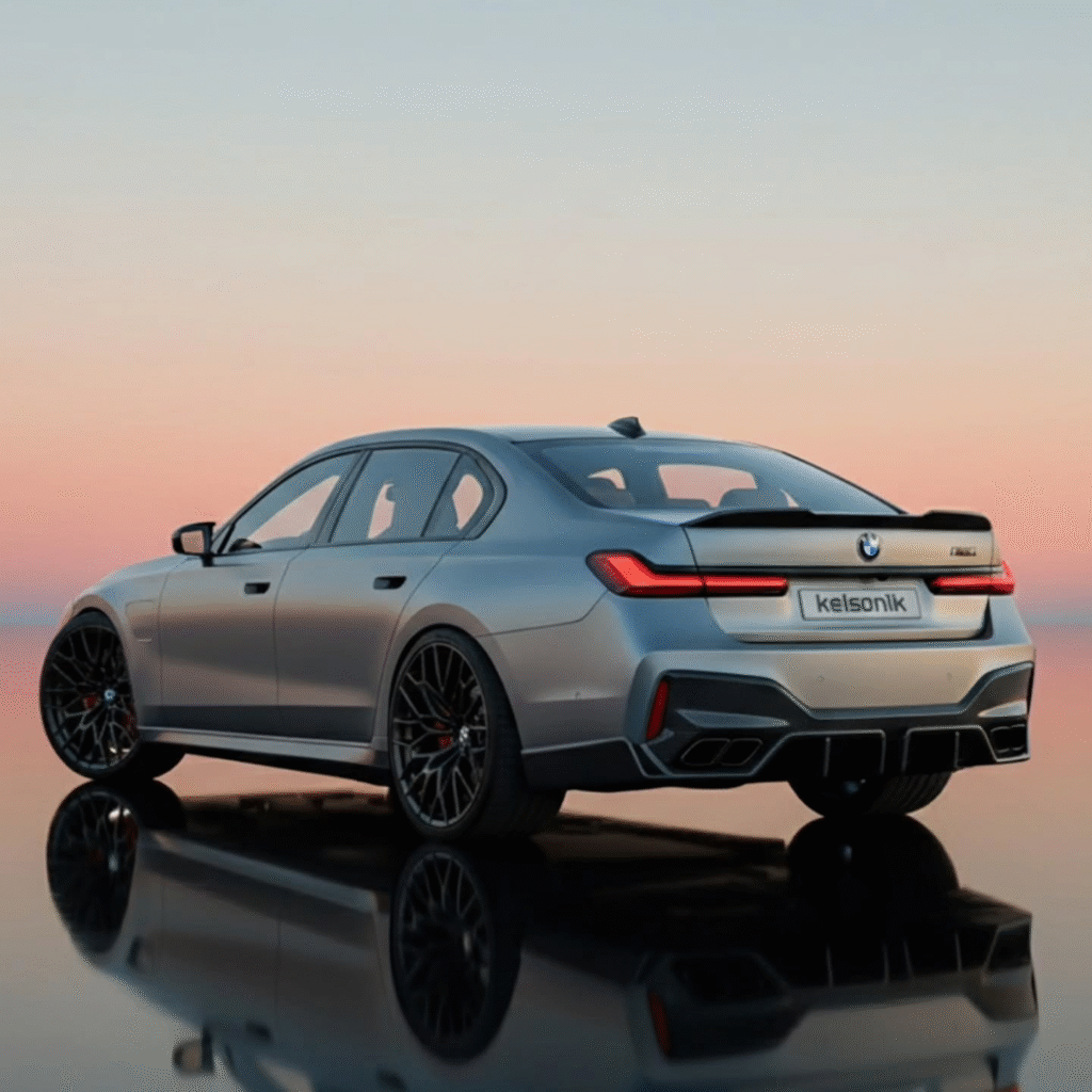 The BMW M7 takes centre stage here, a super saloon rendered by Kelsonik with the kind of purpose that fans have long craved. This digital take pares back the standard car’s divisive cues and leans into classic M intent: the kidney grilles are tighter and blacked out, the split lamps are replaced by a single, cleaner lighting signature, and a reworked bumper adds broader intakes and a crisper lower grille. The result looks lower, wider and far more planted, as if the chassis is already loaded up for a fast fourth-gear sweep.