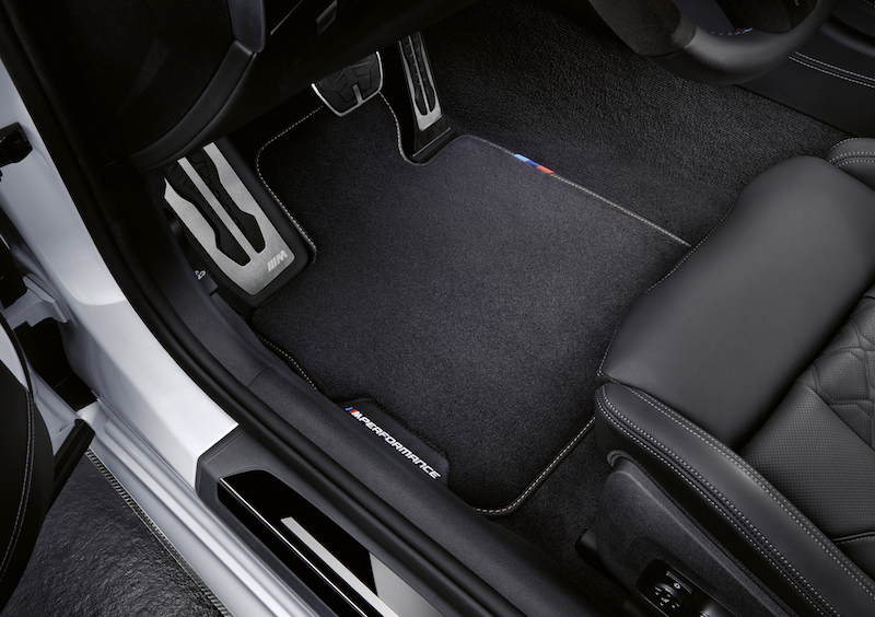 When it comes to being able to fully explore the striking talents of the new BMW M8 models in terms of driving dynamics at any time, a key factor is the M Performance Pro steering wheel with carbon fibre shift paddles and carbon fibre/Alcantara – carbon fibre/leather trim. Thanks to its impressively shaped Alcantara grip areas with large thumb rests and special underlay, it guarantees excellent grip therefore a direct steering feel. With their shift symbols in bold red, the carbon fibre shift paddles – also separately available for the standard steering wheel – emphasise the racing theme, as do the blue central marking on the M Performance Pro steering wheel and its seam in the hallmark M colours of blue, red and violet. The refined motor racing ambience can be perfectly rounded off with non-slip, easy-grip M Performance floor mats made of velvet velour with leather-style surround, M Performance inscription and a pennant in the typical M colours.