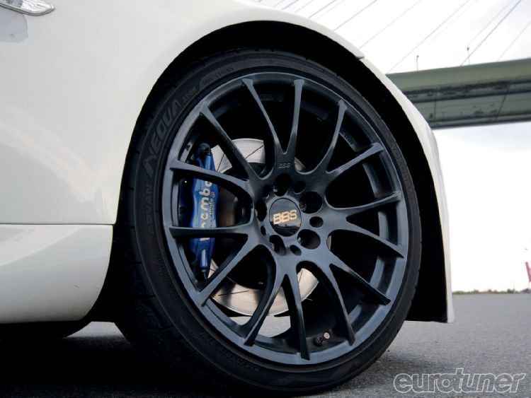 Wheels & Tires: 19×9” ET22 front, 19×10” ET25 rear BBS Japan RE-V wheels painted matte black, 35mm spacers on rear, 235/35 R19 front, 265/30 R19 rear Yokohama Advan Neova AD08 tires