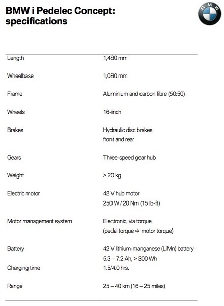 Because the electric hub motor only assists the rider’s pedalling up to 25 km/h (16 mph), the BMW i Pedelec Concept does not need to be insured or registered, no licence is required to use it, and the rider does not have to wear a helmet. Depending on the nature of the route, rider’s weight and degree of motor assistance utilised, a full battery charge will give a range of 25 – 40 kilometres (16 – 25 miles). Under braking and when riding downhill, the hub motor acts as a generator and supplies the battery with energy. It takes just four hours – or 1.5 hours on a quick charge – for the empty battery to be fully recharged, either from a domestic plug socket or inside the boot of the BMW i3 Concept.