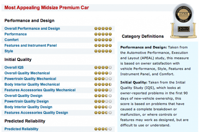 J.D. Power and Associates names the new BMW 5 Series the “Most Appealing Midsize Premium Car.â€Â The F10 5 Series Sedan scored the highest points in the following categories: Overall Performance and Design, Performance, Comfort, Features and Instrument Panel and Style.