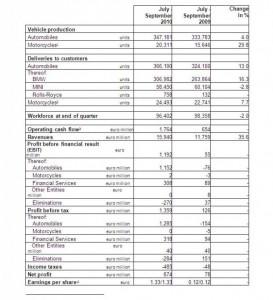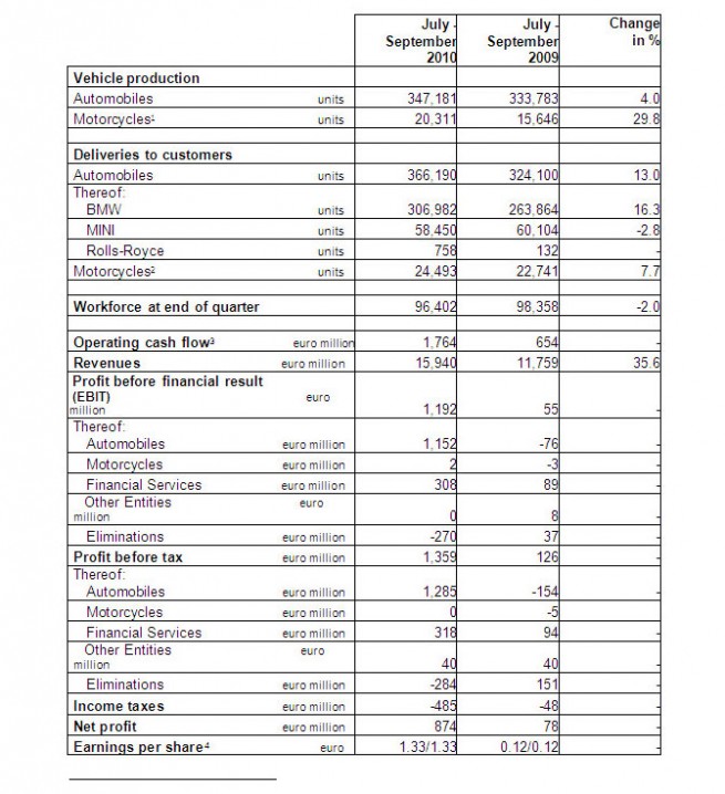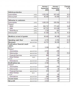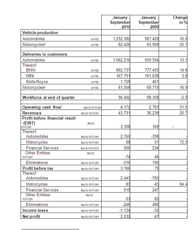 Nine-month revenues grew by 20.7% to euro 43,731 million (2009: euro 36,239 million), with an EBIT of euro 3,358 million (2009: euro 169 million) and a profit before tax of euro 3,166 million (2009: euro 79 million). Profit after tax for the period amounted to euro 2,032 million (2009: euro 47 million). The total number of BMW, MINI and Rolls-Royce brand vehicles delivered to customers up to the end of September increased by 13.1% to 1,062, 216 units (2009: 939,554 units).