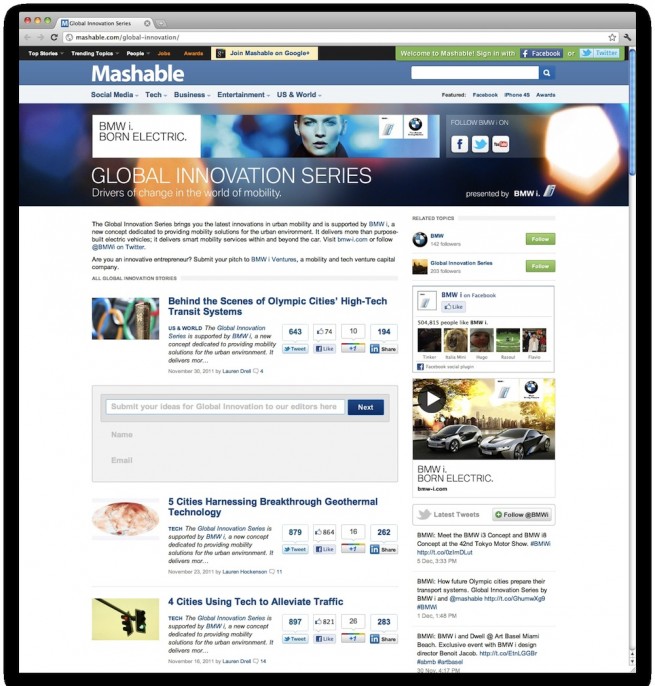 The presence of BMW i on the pages of the online news platform Mashable.com rounds off the sub-brand’s cooperative marketing activities. This project has been running since April 2011 and will continue in 2012. BMW i presents Mashables 20 million visitors per month with weekly news updates on the topic of mobility and technology in the category “Global Innovation Series†at http://mashable.com/global-innovation. Visitors to the site are similar in profile to the BMW i target audience with regard to content and issues. Mashable.com therefore provides a particularly relevant platform for positioning BMW i topics.