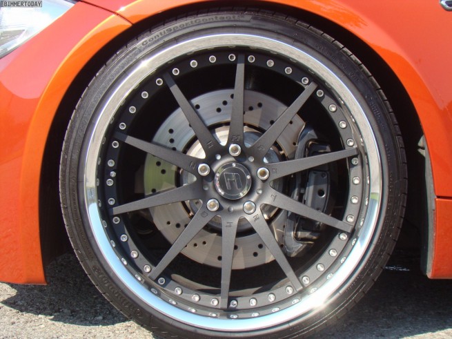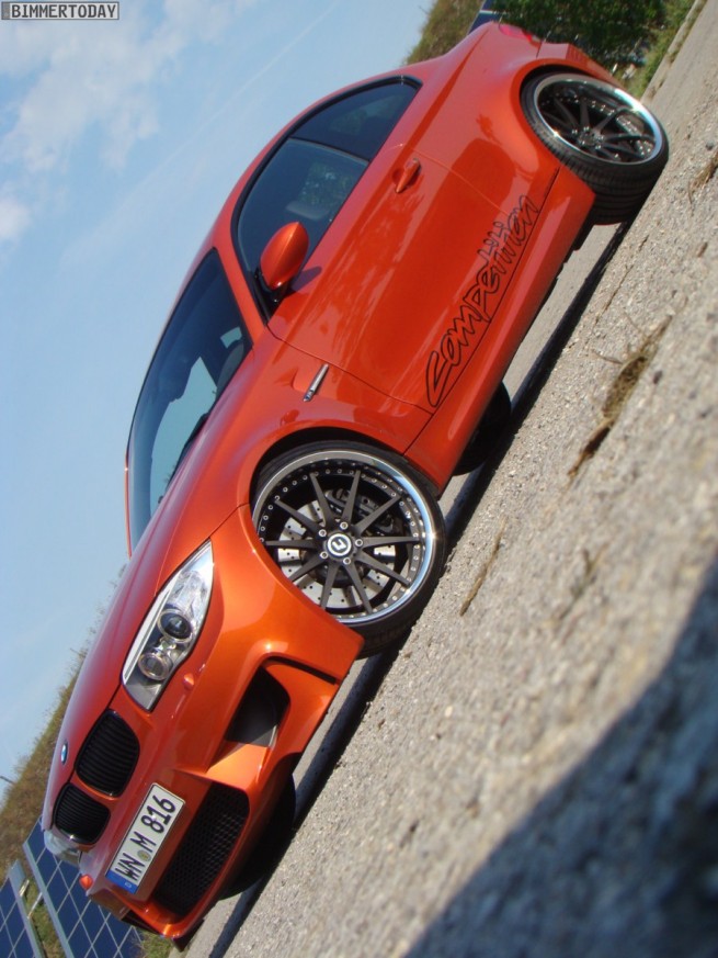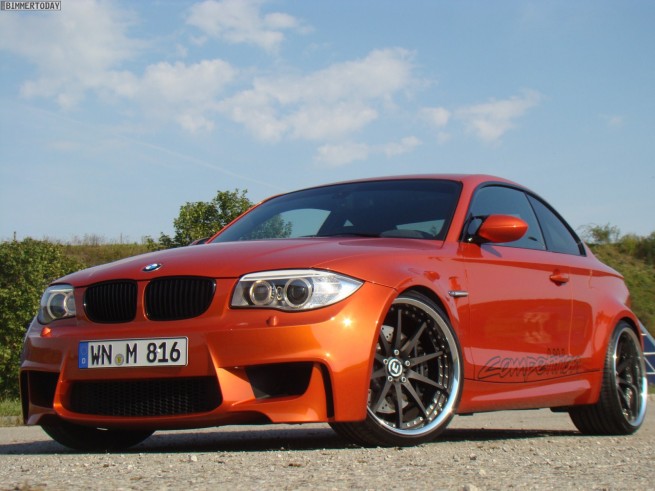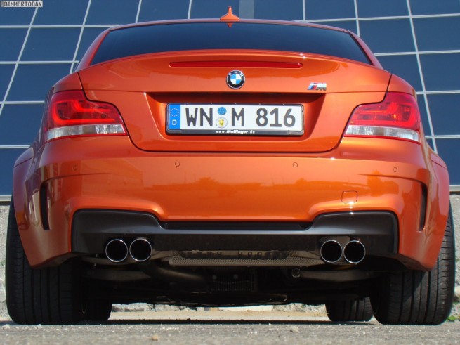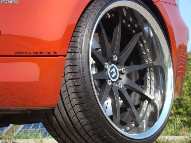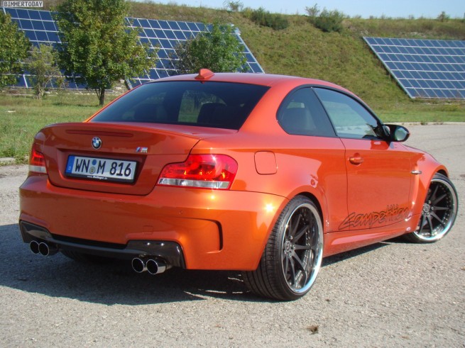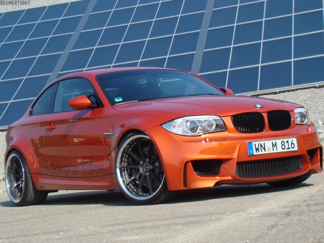 TVW Car Design, a German tuner, unveils their own take on the BMW 1 Series M Coupe: Orange Competition. TVW includes an adjustable KW coilover suspension that was specially adapted for TVW and developed on a test rig. The new chassis offers a more balanced handling and sportier ride. TVW Car Design enhances the visual aspect of the 1M, starting with a new BMW Performance carbon-fiber rear spoiler, black painted roof made out of carbon-fiber and blacked out 20 inch wheels, and 245 and 295 tires at front, respectively in the back. Thanks to a new exhaust system, a much bulkier intercooler and appropiate software engine tuning, power climbs to 420 horsepower at 5,900 revolutions per minute with the peak torque climbing from 500 to a maximum of 620 Nm, between 1,500 and 4,500 rpm. TVW Competition C01 has a top speed of 187 mph (306 km/h). Inside, the “default sporty seats†go out and leather-covered bucket seats will provide better support for the super sporty drivers. A steering wheel with LED indicators provided by BMW Performance, increases the overall look and feel of the 1M. Installation and customization of the software will set you back 5000 euros, while the exhaust system is sold separately at 1,850 euros.