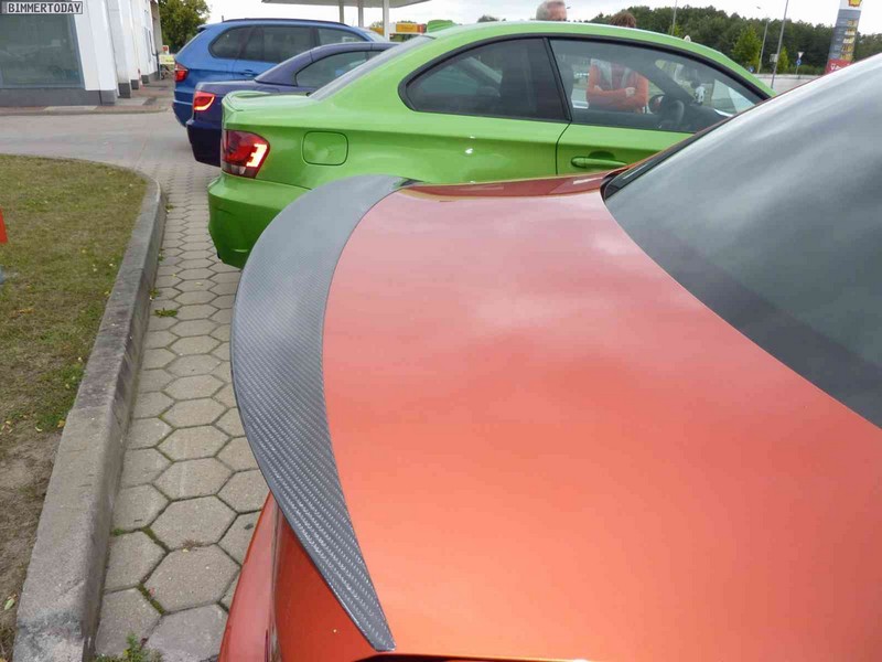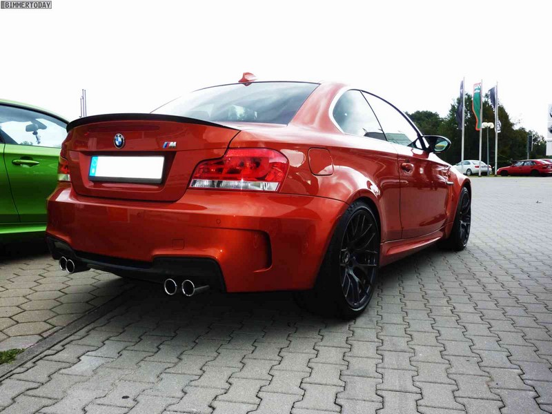 At BMW Wernecke dealership in Wildau’s event last Saturday, two 1Ms stood out: one Green Mamba and the other in Valencia Orange. Thanks to BMW Individual, the Java Green paint job was accentuated by racing black stripes on the hood, blacked out kidney grilles, dark chrome tailpipes and M3 GTS-like wheels. It is 6328 out of 6331 units sold worldwide. The Valencia Orange 1M on the other hand has M Performance black kidney grille, carbon fiber trunk spoiler and mirror caps, and blacked out wheels and exhaust tips.