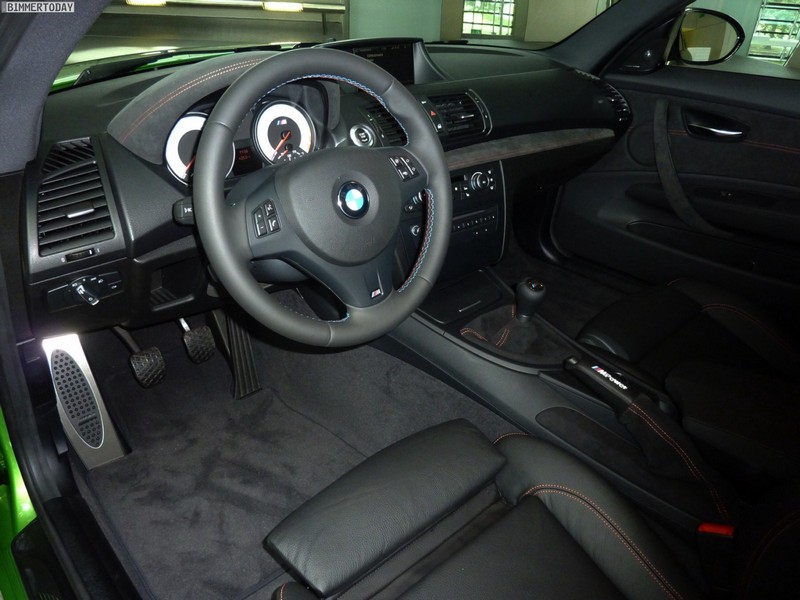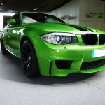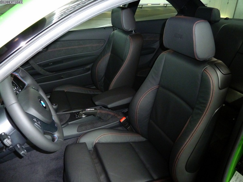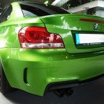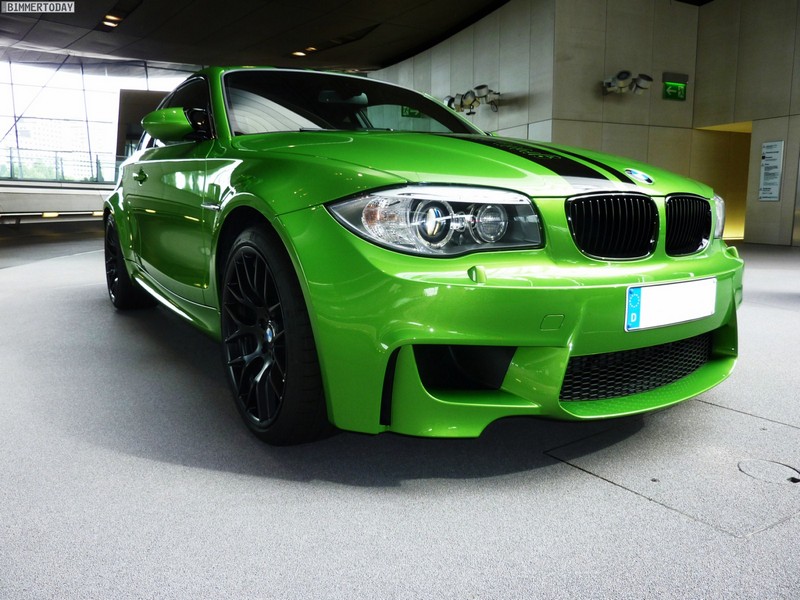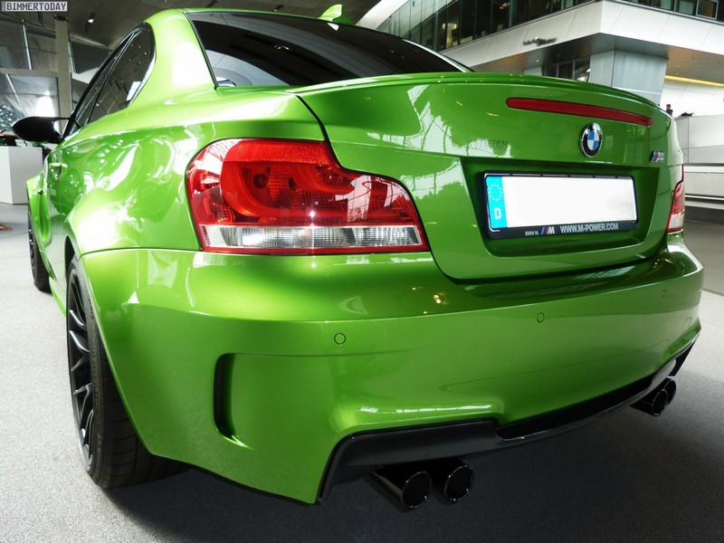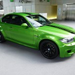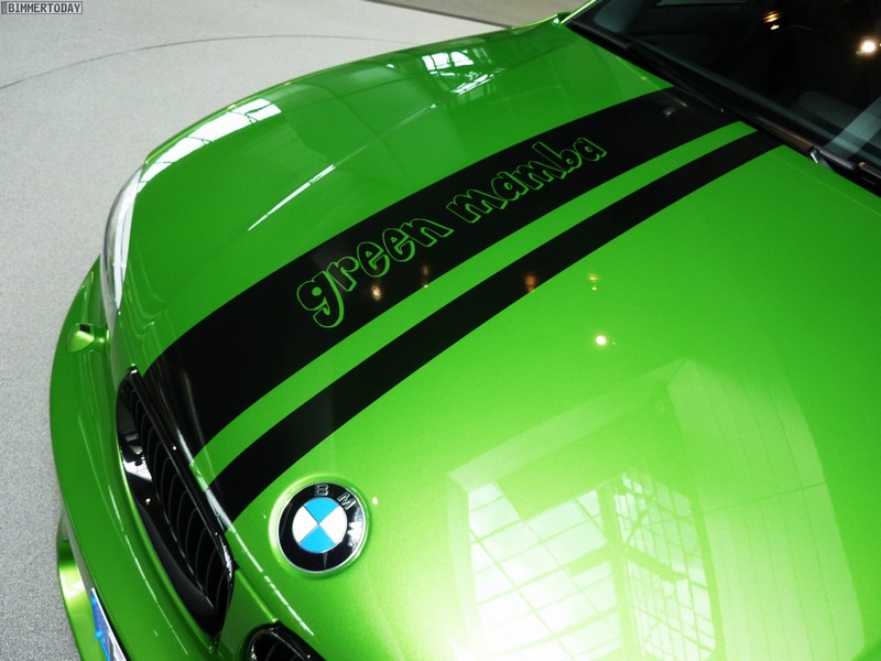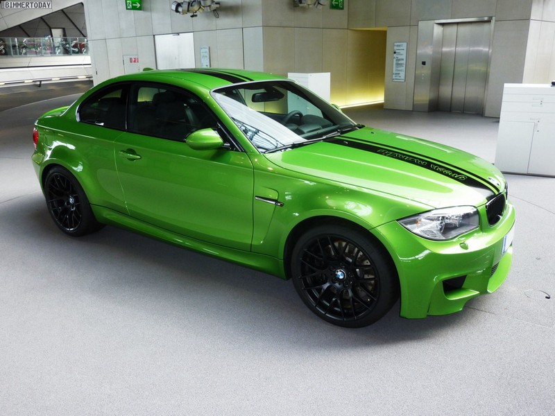 The BMW 1M in Java Green color dubbed “Green Mamba” is now on display at the BMW Welt in Munich. The owner of this vehicle sought the help of BMW Individual to customize his 1M. The customization process started with the Java Green paint job, accentuated by racing black stripes on the hood, blacked out kidney grilles, dark chrome tailpipes and M3 GTS-like wheels. The Java Green paint costs 4,300 euros, the GTS wheels an extra 1,200 and the other chrome dark parts set the owner back another 3,600 euros.