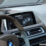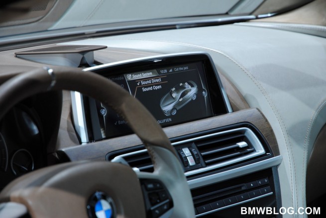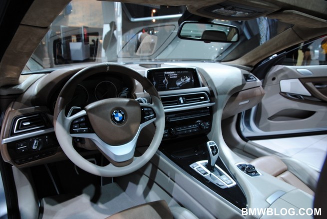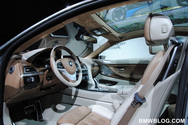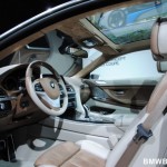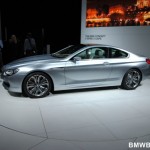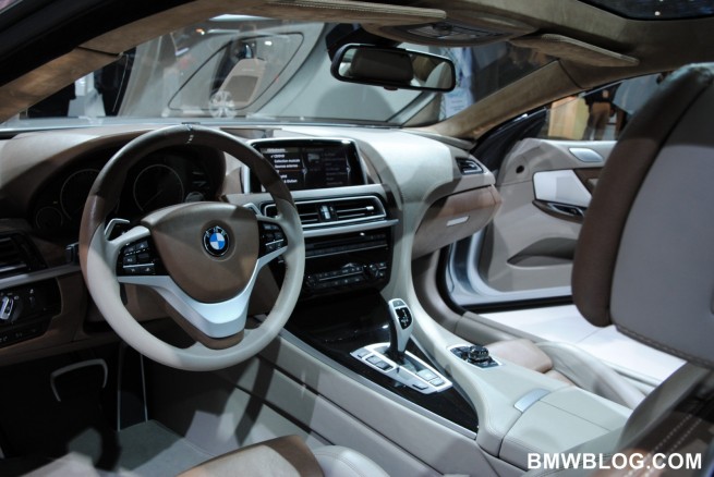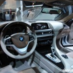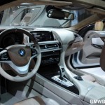 BMW 6 Series Coupe is the first BMW vehicle to get full LED treatment; driving lights, indication lights, brake lights and rear-lights. Other features include swollen front fenders, after which a sharp, chiseled upper body emerges. It has a wider track that the other 6 series models but has the same length. The suspension has been lowered to enhance the sportiness of the vehicle. The design language is fluid and sculpted, achieving an aggressive and elegant look. The front end of the vehicle appears to be shark-like in shape, as described by BMW’s Chief Designer Adrian van Hooydonk. An additional feature of the BMW Concept 6 Series Coupe is its panoramic glass roof.