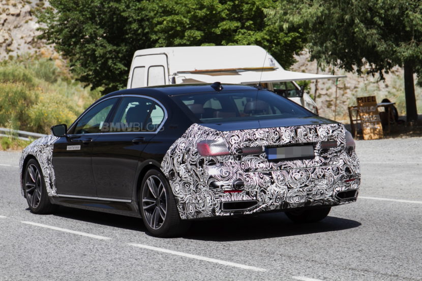 Testing rounds have begun for the upcoming BMW 745e hybrid as the German automaker plans to refresh its plug-in hybrid lineup with a new model in 2019. This new model will be launched together with the BMW 7 Series Facelift (LCI). It will be a r eplacement to the current 740e and 740Le models and will offer a considerable amount of upgrades compared to the current iPerformance 7 Series model. It will have more power – 390 HP from a hybrid setup in particular. Under the hood we’ll get the same 2-liter 4-cylinder turbocharged engine while the electric motor will also get small bump in power. The batteries will be new and with higher energy density for a longer range. This model will also come with wireless charging capabilities so owners can charge their cars at home. These new photos show a black 7 Series test mule that has its entire front and rear ends covered in camouflage. So BMW is clearly making so decently sized changes to the face and rear of the 7 Series. It also signals a redesigned, sportier front bumper.