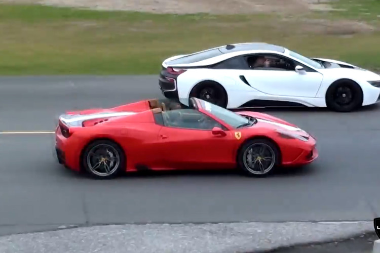 Check out a Ferrari 458 Speciale Aperta starting up, doing some REVS and drag races against a BMW i8 and others cars.