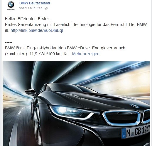 The taunting between BMW and Audi on laserlights continues. BMW Germany posted on their Facebook Page the following: “Heller. Effizienter. Erster. Erstes Serienfahrzeug mit Laserlicht-Technologie für das Fernlicht. Der BMW i8.†In English, “Brighter. Efficient. First. First production car with laser light technology for the high beam. The BMW i8. …